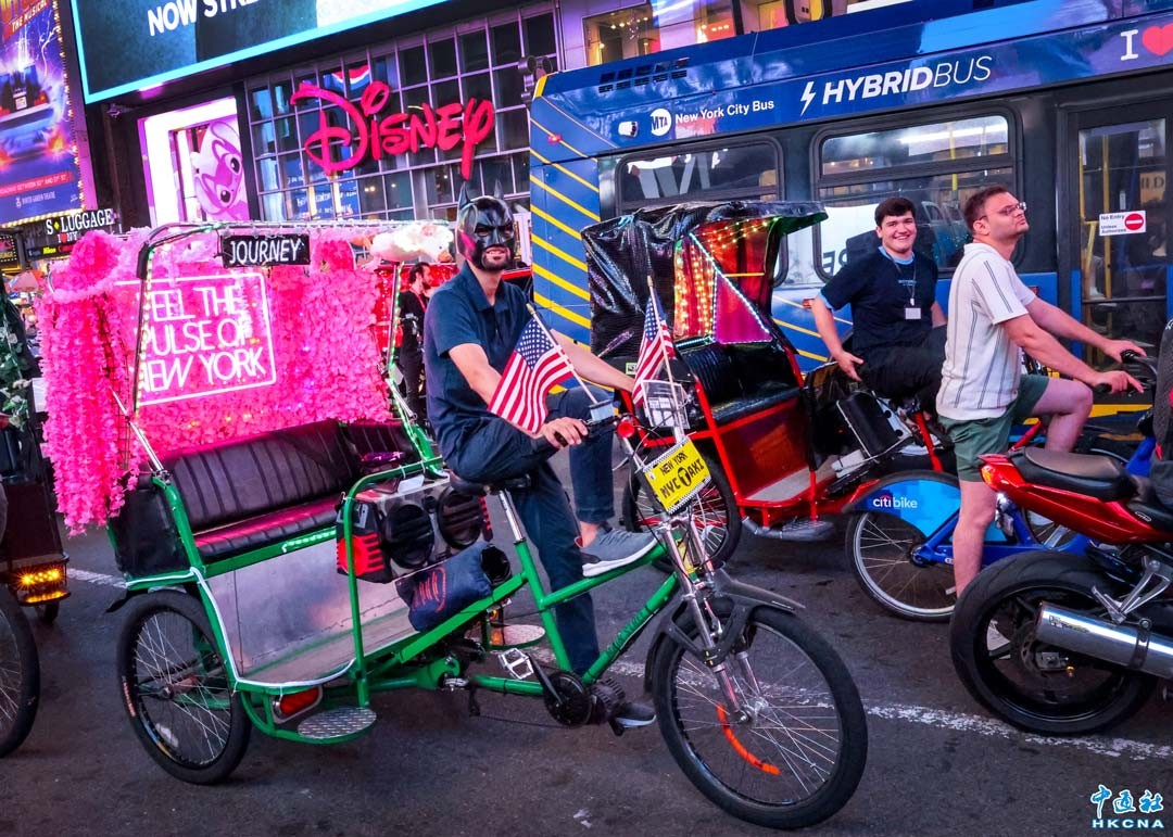 當地時間8月28日,美國勞工統計局公佈的7月大都會區就業和失業數據顯示,美國十個城市中有九個的失業率在當月上升,其中40%以上的城市平均周薪下降,反映出勞動力市場的廣泛放緩。圖為美國紐約時代廣場載遊客觀光的三輪車夫。 (香港中通社記者 徐文峰攝)