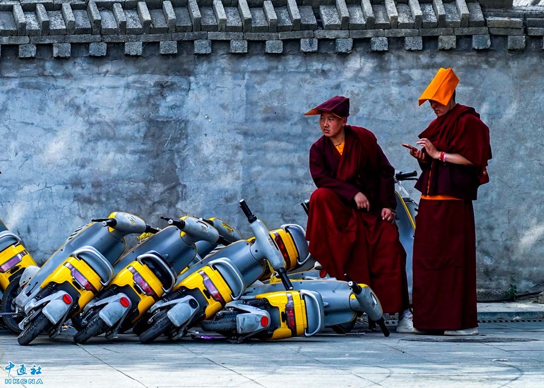 青海省是中國少數民族藏族主要聚集地之一。行走在青海,藏族人文風情濃郁,穿藏袍、吃糌粑、喝酥油茶、畫唐卡、獻哈達,遠方的客人會驚訝於藏族文化雖然如此特別,卻早已和現代化城市融為一體。圖為玉樹的一處共享電動車,喇嘛正在乘涼刷手機,古老的藏族服飾與現代電動車相稱,畫面非常吸引眼球。 (香港中通社記者 陳卓儀攝)