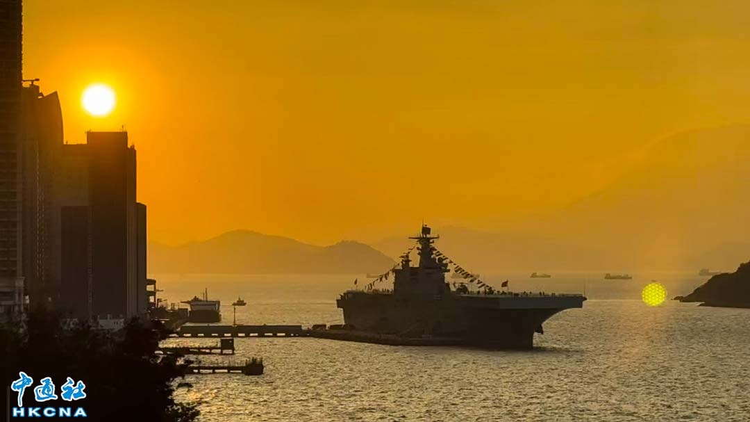 2024年11月22日,中國海軍軍艦海南艦停泊在香港招商局碼頭,在夕陽下熠熠生輝。由海軍海南艦、長沙艦組成的編隊21日抵達香港,展開為期5天的訪問。 香港中通社圖片