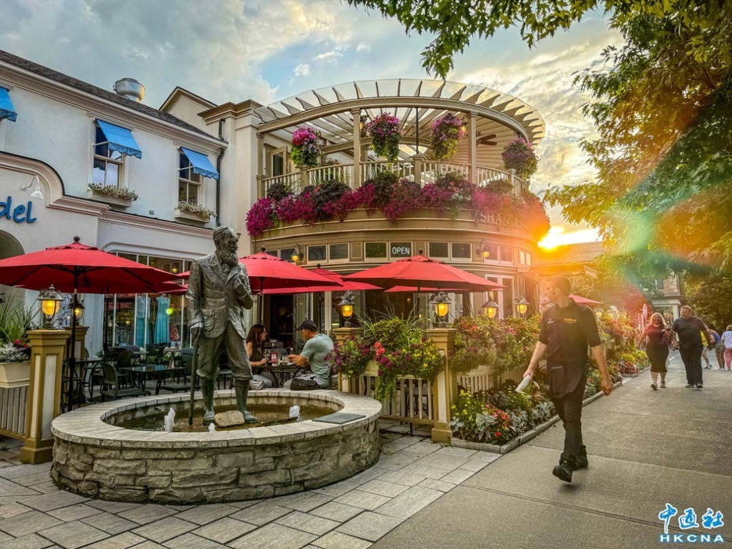 尼加拉湖濱小鎮(Niagara-on-the-lake)被譽為"加拿大最美小鎮",坐落於尼亞加拉河匯入安大略湖的入湖口西岸。大街兩旁的維多利亞式建築,恍似進入了電影場景中的小鎮,看看擺設優雅商店,在露天茶座看著馬車踱步,是體驗加拿大悠閒生活的極致。圖為落日餘暉影照下的露天茶座與愛爾蘭著名劇作家蕭伯納的塑像。 (香港中通社記者 徐文峰攝)