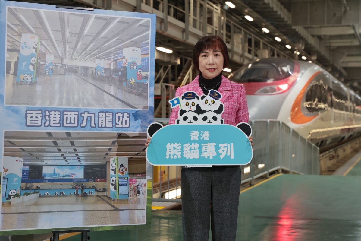 香港新聞網1月8日電(記者 謝光磊 ) 1月8日,港鐵夥拍香港旅發局推出的高鐵“香港熊貓列車”亮相,該列車本週六(1月11日)起,一連12個星期,逢週六日及指定時間行駛。“香港熊貓列車”由動感號改造,大熊貓圖案遍布車內、車外,不單化身高鐵司機,更擔任宣傳大使穿梭多個香港旅遊地標,為乘搭列車訪港的旅客介紹打卡點。