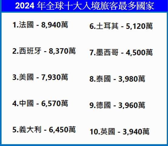 2024全球十大入境旅客最多國家排名。(數據來源:Data Pandas) 2024年,全球旅遊業迎來了全面復甦,國際遊客數量創歷史新高。根據數據公司Data Pandas日前發佈的統計數據,2024年全球接待入境遊客排名前十的國家共接待國際遊客達到5億9760萬人次,創下新高。其中,法國以高達8,940 萬人次的入境人數位居榜首;西班牙和美國分別以8370萬、7930萬入境人次居第二和第三;亞洲僅有中國和泰國進入前十,其中中國以6570萬入境人次排名全球第四,成為亞洲接待國際遊客最多的國家之一。 從報告中可以看出,歐洲國家依舊是國際遊客的主要目的地,佔據了全球旅遊市場的近50%;亞洲地區,尤其是中國強勢崛起,排名亞洲第一,成為全球遊客入境的熱門選擇。 董觀志認為,三個因素促進了2024年中國旅遊業的崛起。首先是中國文化與自然資源的吸引力,從故宮、長城、兵馬俑等世界文化遺產,到桂林山水、張家界、九寨溝等自然奇觀,中國的旅遊資源涵蓋了歷史、人文與自然的多重維度,吸引力凸顯;其次是政策支持與國際化發展。2024年,中國進一步優化了簽證政策,目前中國單方面免簽的國家已增加到38個國家,“一帶一路”倡議也促進了沿線國家與中國之間的旅遊合作。同時以高鐵為代表的中國交通基建項目,顯著縮短了城市間的旅行時間,為遊客提供了便利;第三是新興旅遊形式快速發展,文化旅遊、鄉村旅遊、生態旅遊及沉浸式體驗項目受到國際遊客的熱捧。 相比國際水平,中國旅遊消費成本總體偏低。據全球國家和城市比較統計網站Numbeo統計,在全世界94個國家和地區的普通餐廳消費中,中國以3.51美元排在第79位。一些數據也說明中國消費品物美價廉,據中國文化和旅遊部的數據,2023年全國星級酒店平均房價為370.83元。 最近幾年,中國政府不斷推進國內旅遊業國際化的步伐。2024年9月,國務院辦公廳發佈《關於以高水平開放推動服務貿易高質量發展的意見》,提出提升旅行服務國際競爭力、積極發展入境游,同時出台優化簽證和通關政策,并提供多樣化的支付服務、便利的住宿政策,并鼓勵國內航運企業積極拓展新航線,增強國際遊客的旅行體驗。 “高質量發展就是從原有的‘國家級’標準邁向‘世界級’水準的重要轉型和升級。”董觀志表示,雖然2024年中國的國際遊客接待量表現優異,但與排名前列的國家相比仍有一定差距。高質量發展的內在邏輯,包括文化傳承與創新、旅遊產品多元化、服務質量提升等多個方面,中國旅遊業要形成世界級的產業經濟和產品體系,仍需不斷強化自身實力。 (完) 【編輯:錢林霞】