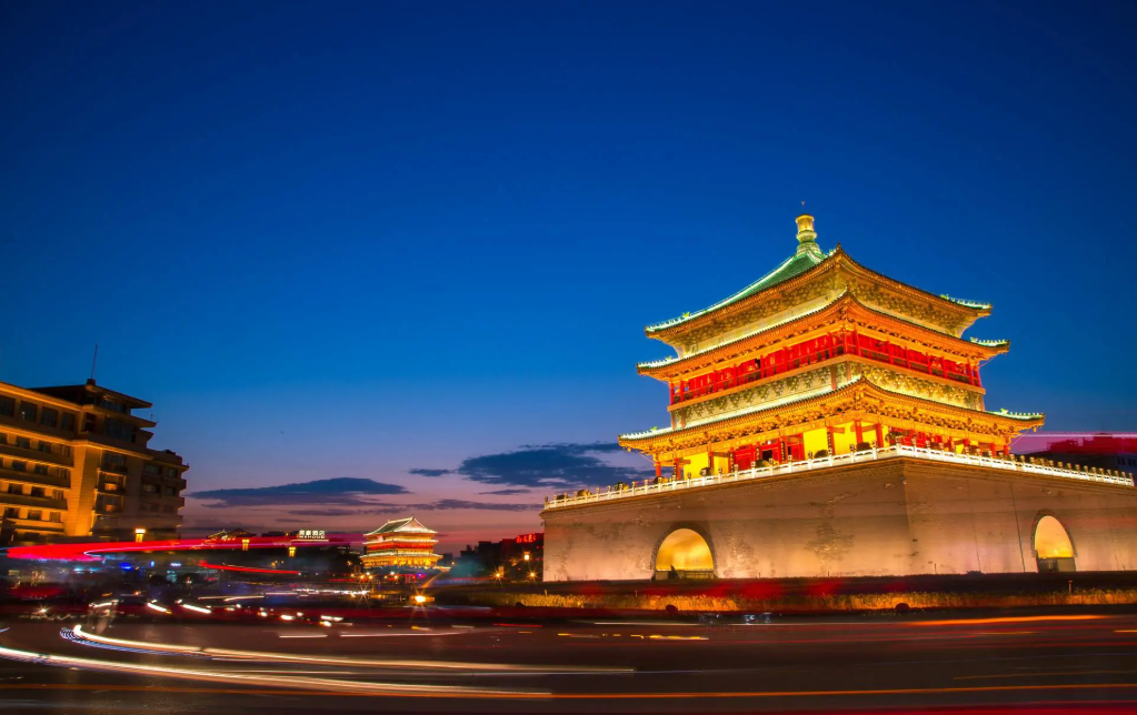 西安古城墙。 鐘樓和鼓樓這兩座古建築是西安的標誌性建築之一,以其古樸典雅的建築風格和悠久的歷史背景,成為了遊客們必打卡的景點之一。登樓可俯瞰整個市區的美景。鐘樓和鼓樓相距僅300多米,建議購買套票(約50元),以節省費用。 位置:陝西省西安市新城區西安四條大街交匯處西安地鐵2號線鐘樓站C出口正對面 特色小吃:附近有回民街,可以品嚐地道的西安小吃,如肉夾饃、羊肉泡饃、涼皮等。這裡的小吃種類繁多,是西安美食的集中地。 大雁塔
