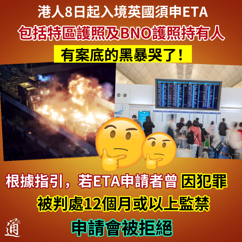 港人入境英國須申ETA,有案底的黑暴哭了香港新聞網1月10日電 英國政府一個新規定,令香港“手足”淪為“棄卒” ? 英國1月8日起實施新入境規定。包括香港及澳門特區等數十個國家及地區的人士,前往英國旅遊、探親、公幹或過境須先申請ETA(電子旅遊授權),否則旅客可能不被允許登機。 根據公布,不論是持有特區護照還是英國國民(海外)護照(BNO護照),入境或過境英國前,都需支付10英鎊(約100港元)申請有關電子許可證;BNO簽證持有人可獲豁免。 英國聲稱ETA計劃是為了加強邊境安全,卻令部分香港“手足”大感心碎。