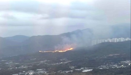 (香港中通社記者 謝光磊 攝) 香港中通社圖片 綜合港媒報道,周六(1月11日)下午5時31分,警方接報林村近雞公嶺位置發生山火。隨後,火勢迅速蔓延,形成一條長約80米的火線。消防部門立即出動山火拍救援,全力控制火勢。