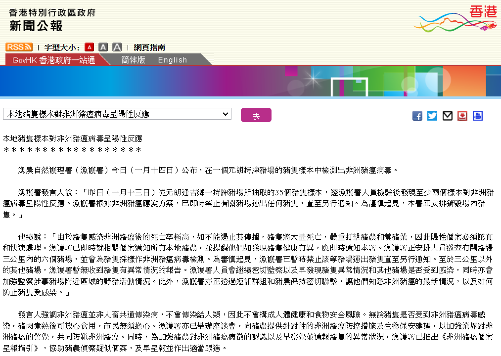 香港元朗豬場有豬隻樣本檢出非洲豬瘟病毒香港新聞網1月14日電 香港特區政府漁農自然護理署14日公布,在一個元朗持牌豬場的豬隻樣本中檢測出非洲豬瘟病毒。 漁護署發言人指,13日從元朗逢吉鄉一持牌豬場所抽取的35個豬隻樣本,經漁護署人員檢驗後發現至少兩個樣本對非洲豬瘟病毒呈陽性反應。漁護署根據非洲豬瘟應變方案,已即時禁止有關豬場運出任何豬隻,直至另行通知。為謹慎起見,本署正安排銷毀場內豬隻。 他續指,由於豬隻感染非洲豬瘟後的死亡率極高,如不能遏止其傳播,豬隻將大量死亡,嚴重打擊豬農和養豬業,因此陽性個案必須認真和快速處理。漁護署已即時就相關個案通知所有本地豬農,並提醒他們如發現豬隻健康有異,應即時通知本署。漁護署正安排人員巡查有關豬場三公里內的六個豬場,並會為豬隻採樣作非洲豬瘟病毒檢測。為審慎起見,漁護署已暫時禁止該等豬場運出豬隻直至另行通知。至於三公里以外的其他豬場,漁護署暫無收到豬隻有異常情況的報告。漁護署人員會繼續密切監察以及早發現豬隻異常情況和其他豬場是否受到感染,同時亦會加強監察涉事豬場附近區域的野豬活動情況。此外,漁護署亦正透過短訊群組和豬農保持密切聯繫,讓他們知悉非洲豬瘟的最新情況,以及如何防止豬隻受感染。