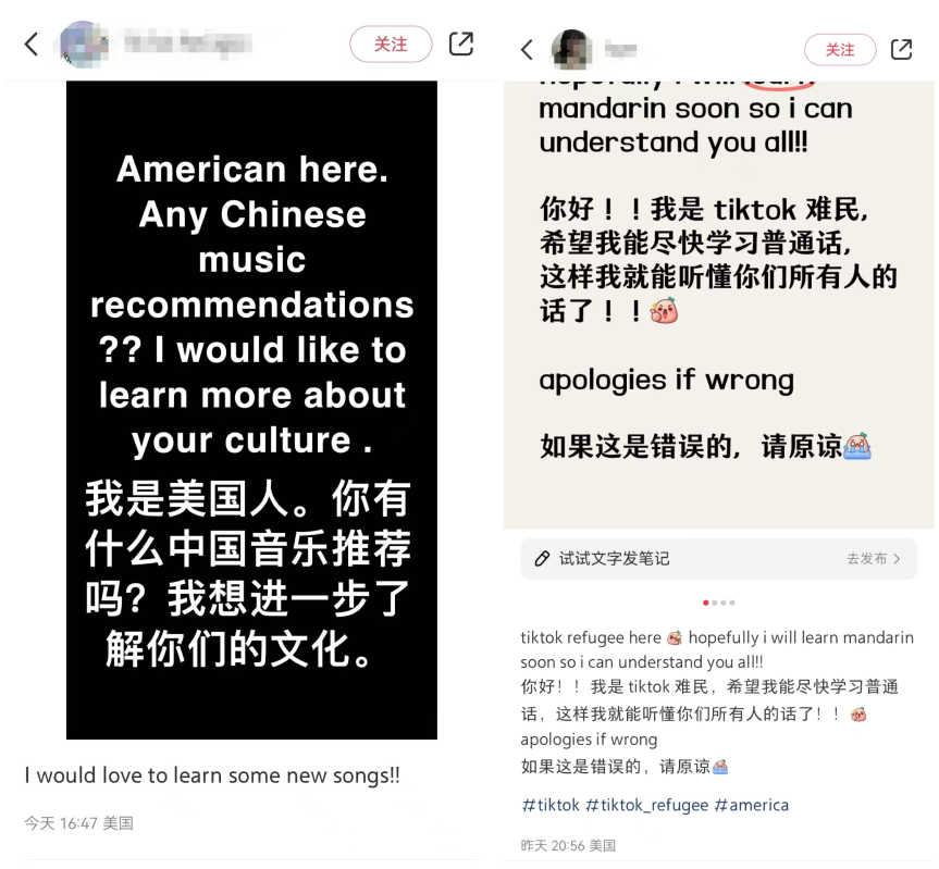小紅書於2013年推出,原是購物分享社區。現已成為中國增長最快的社交平台之一,坐擁3億月活用戶。小紅書常被描述為中國版的Instagram,用戶可在小紅書上發佈圖文和短視頻,用法與TikTok類似。正因如此,小紅書快速成為美國TikTok用戶們的最好替代品。 這些外國網友會用生澀的中文發帖,甚至自嘲是“TikTok Refugee(TikTok難民)”。中國網友普遍對他們的到來表示歡迎,與他們進行著友好互動,在“TikTok Refugee”詞條的貼文下評論清一色的“Welcome”(歡迎)。甚至有人向美國網友請教英文作業,還調侃說:“這下(中國)網友們學英語的語境有了。” 有美國網友表示,希望在小紅書打開一扇門,與不一樣的人見面。還有美國網友主動提出想瞭解中國文化,甚至表示想學習中文,來更好地融入。熱心的中國網友也積極回應,中美網友隔空在小紅書上熱絡地互動起來。