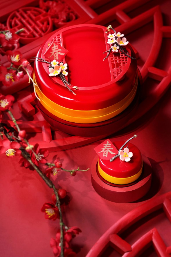 (香港新聞網製圖) 港麗酒店“桃花春韻”賀歲蛋糕 充滿春節氣氛的蛋糕,新春大紅主色招好運,桃花寓意吉祥如意。紅色鏡面外層包裹著層層相間的日本柑橘果醬、茉莉茶朱古力慕絲、牛奶朱古力脆脆及黑朱古力海綿蛋糕,面層綴以手製桃花裝飾及亮金色的“春”字。柑橘味柔和清新,蛋糕柔軟層次感豐富,甜度剛好。只要購買1.5磅裝賀歲蛋糕,便可以優惠價換購限量版“金福招財”港麗小熊,用來送禮為對方送上財運祝福。 香港港麗酒店餅店 地址:香港金鐘道88號太古廣場香港港麗酒店大堂低座 電話:2822 8813 推出日期:由即日起至2月5日期間自取(蛋糕需於最少3日前預訂) 網上商店:按此
