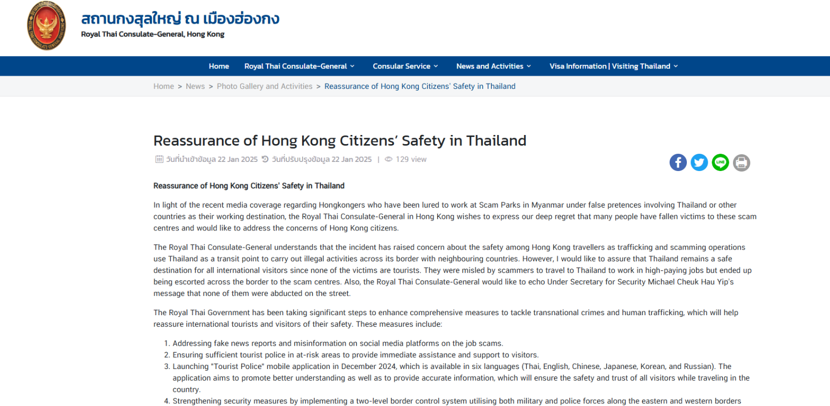 “保安局專責小組與泰國相關部門已建立直接聯繫,加強日後溝通及情報交換,相信能更有效地跟進個案。”鄧炳強說,保安局還加強與相關國家駐港總領事館的聯繫,得到正面回應。香港也一直與內地和世界各地的執法單位有聯繫。如有需要,亦會與他們直接接觸,交換情報,打擊罪案。 泰國駐香港總領事館22日晚間就發出聲明表示,泰國政府一直在采取步驟加強打擊跨國犯罪和人口販運的綜合措施,泰國總領事館亦已張貼警告橫幅,提醒香港旅客或在泰國尋找工作的人士聯絡總領事館核實。