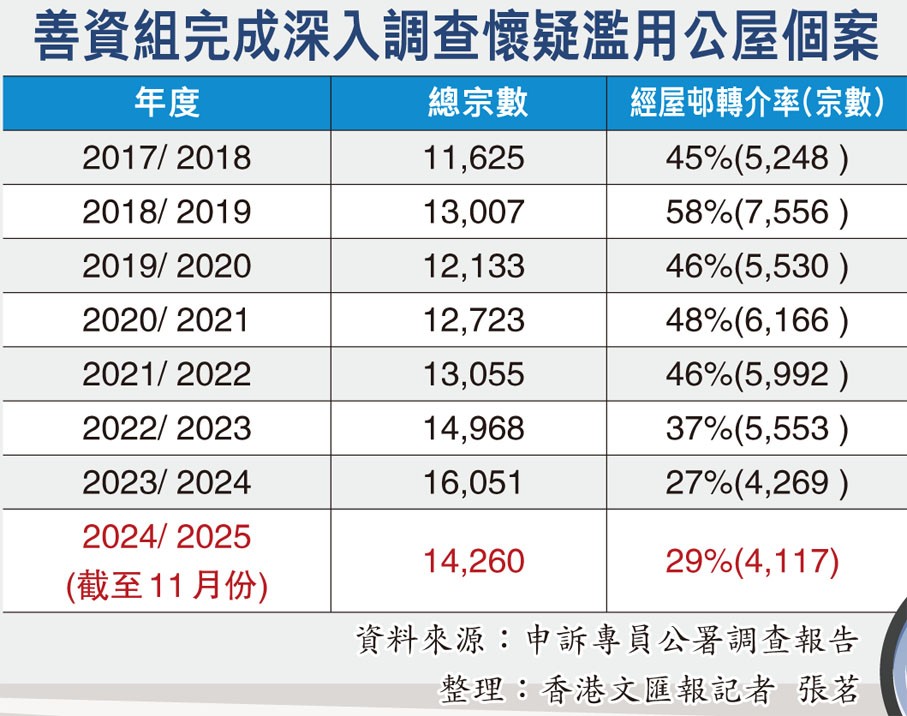 據香港文匯報圖片 去年檢控率僅4.2% 有改善空間 陳積志表示,現屆政府在2022年7月上任以來,房屋署已合共收回逾7,000個被濫用及違反租約條款的單位,“總數比一個大型屋邨的單位總和還要多。”但公署認為有關工作仍有改善空間,以去年為例,房署揭發超過12,000宗濫用公屋個案,僅500多宗被檢控,佔整體4.2%,這已是7年來最高紀錄,當中不少嚴重違規個案因超出兩年檢控時限,最終只是收回單位了事。公署建議房委會應該全面檢討如何在檢控時效內發現及蒐集足夠證據作出檢控,以提高檢控率及入罪率。 公署抽取房委會其中9宗濫用個案調查,發現大部分濫用單位住戶,例如把單位非法轉租或虛報資產,非經常持續在單位居住,結果只是被收回單位,沒有被檢控。其中,2023年房屋署善資組收到網上舉報,稱有人在網上出租平台出租屋邨單位,經調查後鎖定涉事單位,再向入境處、運輸署等相關政府部門索取戶主資料後,發現戶主由2019年7月1日至2023年7月12日的1,473天當中,有1,220天(82.82%)不在香港,其間將單位非法轉租。 公署高級調查主任陳利婷表示,房署曾在不同時間突擊查訪該單位。2023年8月22日,房署發出遷出通知書遭戶主上訴,最終上訴失敗,歷時5個月才收回單位,戶主最終亦未被檢控。她分析,案中大廈保安員無就不同陌生人士進出該單位的舉報紀錄,若非有人在網上發現並舉報,該濫用行為不知何時才能被揭發。“多次家訪無人應門、電話號碼顯示無人登記,其實都是濫用公屋的徵兆。如果屋邨辦事處查核戶主出入境紀錄,應該可以發現戶主已不在港居住,更早收回單位。” 倡“富戶政策”涵蓋所有出租屋邨 另外,亦有租戶自2008年起至少5次提交不正確的申報表,隱瞞擁有物業,包括同時持有兩個商舖及一個住宅,但就算申報表資料不齊、明顯有可疑,但屋邨辦事處職員照樣接納。陳利婷說:“這宗個案反映個別的屋邨辦事處人員沒妥善跟進申報表,包括適時跟進申報表遞交時間,以及認真仔細審核申報內容。” 申訴專員公署向房委會及房協提出31項改善建議,包括探討與內地建立渠道以獲取租戶是否擁有內地或澳門特區物業資料;將“富戶政策”涵蓋所有出租屋邨的租戶、檢討周期性家訪的安排、與土地註冊處建立核對機制、加強刑罰等。公屋住戶每兩年要申報有否擁有本地物業,公署提醒要嚴格審核申報表,發現有可疑,可以及早跟進和調查。(完) 【編輯:王少喆】