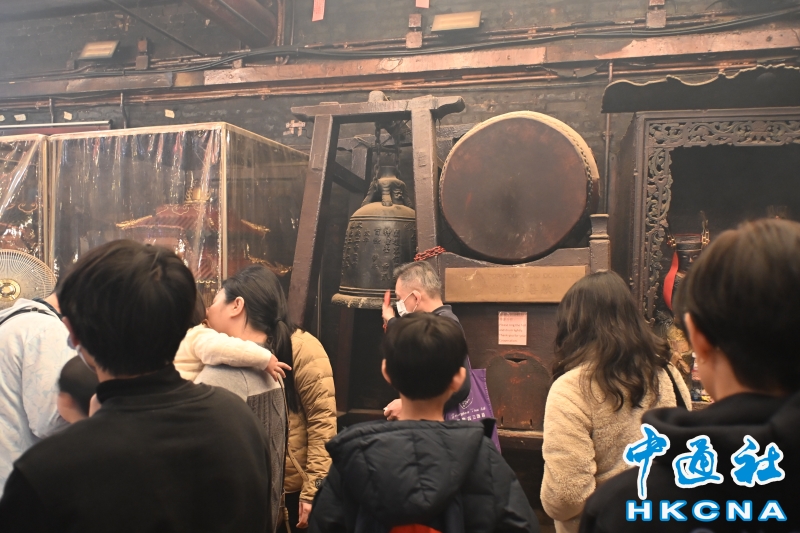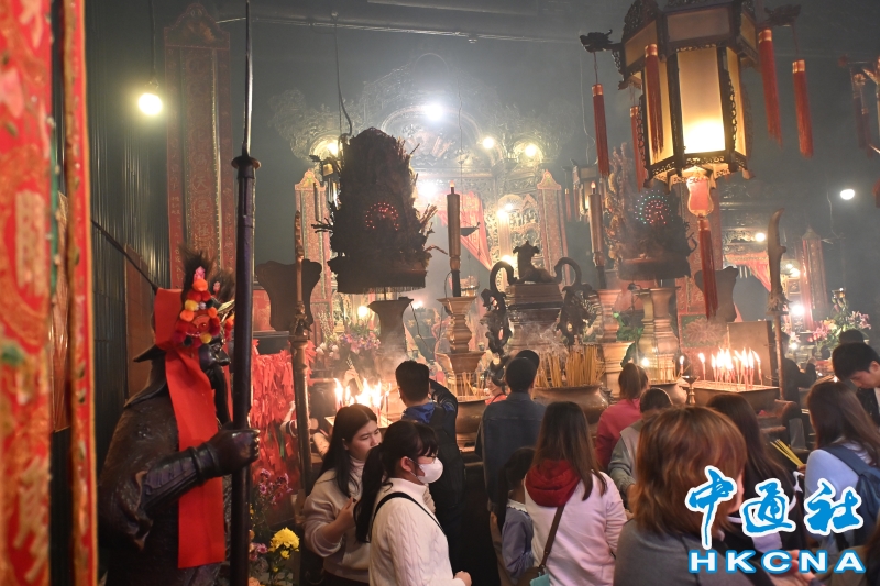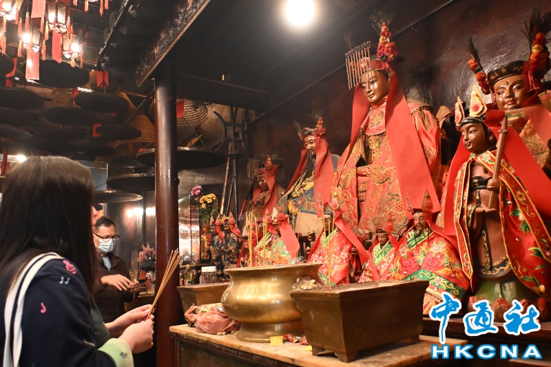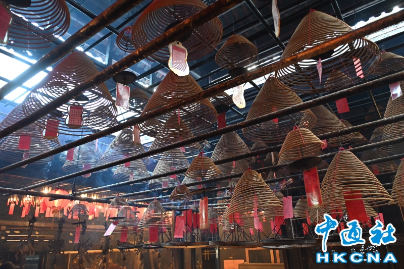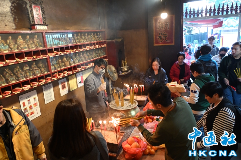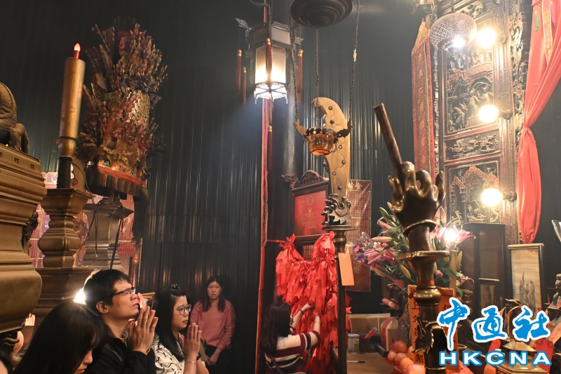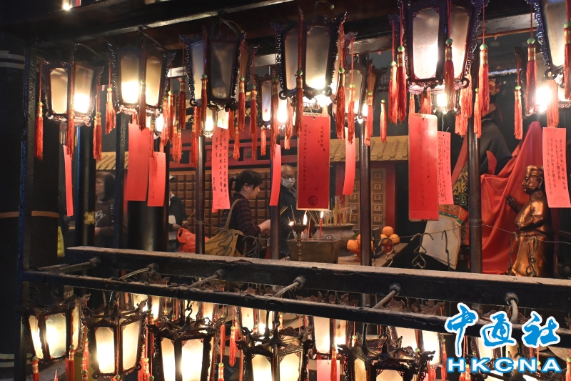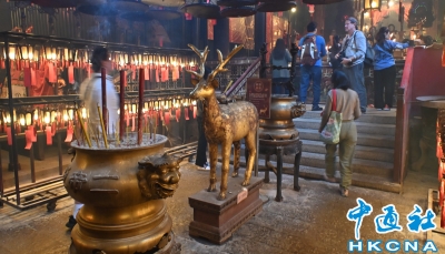 •   香港法定古跡文武廟是香港歷史最悠久的廟宇之一。農曆新年前夕,有許多來自世界各地遊客進香朝拜。位於香港上環荷李活道的文武廟估計於1847至1862年期間落成。文武廟主要為供奉文昌及武帝,列聖宮則用作供奉諸神列聖。文武廟對香港具有重要的歷史和社會意義,反映昔日香港華人的社會組織和宗教習俗。屋頂由綠瓦鋪成的文武廟,估計建於1847至1862年間,由文武廟、列聖宮和公所三幢建築組成。文武廟內還完好地保留了鑄於1847年的銅鐘,和造於1862年的官轎。古廟屋頂的花崗石柱、花崗石門框、木雕匾額和歷史悠久的壁畫,更是巧奪天工,盡顯精湛的傳統工藝和技術,活靈活現地展示中式建築的特色。善信來文武廟,有的祈求學業猛進、有的祈求事事順景。你可以準備元寶衣紙、一紮細香、三枝長壽香及香油錢,奉上香火誠心祈福。其他供品例如生菜寓意“生財”;圓形的橘子類水果則代表圓滿和順利。 (香港中通社記者洪少葵攝)香港中通社圖片