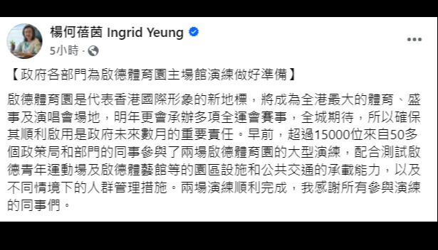 現場觀眾齊唱《中國人》 圖源:橙新聞 據港媒橙新聞報道,大匯演於晚上8時準時開始,可容納5萬名觀眾的主場館,三面座位幾乎全部坐滿,場地中央亦設有數千個臨時座位,由紀律部隊人員組成的樂隊演出多首本港流行曲,在場人士同唱《中國人》、《獅子山下》,氣氛熱烈。約8時20分,警方在主場館進行三個模擬突發事件的演習,包括醉酒鬧事、有人排隊“打尖”引起衝突、有人持假門票入場的處理。 至於體藝館及青年運動場合共有1.3萬人,其中體藝館在晚上9時10分進行緊急疏散演習,青年運動場於9時15分開始自然離場。當大匯演在9時半完結,大批觀眾開始離場,有不少保安和警察維持秩序,並指示往啟德站和宋皇臺站的方向。現場人流眾多,人群行進緩慢,有地段出現擁堵,但到10時左右人流基本完成疏散。 陳國基表示,今次是名副其實的壓力測試,因入場時間與下班高峰期重疊,也是體育園以最高容量6.3萬人同時舉行測試,並在幾乎同一時間散場,不但測試到公共交通的承載能力,還測試到進場、散場的人群管理。 他強調體育園正式開放後,園方會協調不同場館表演時間,不會再出現3個場館同時散場的情況。如果今次6.3萬人的散場都能應付,相信日後體育園最多散場人數為5萬人,亦會處理得好。當局會向參與者發問卷,收集數據後再優化細節,便會宣布正式開幕日期。他又感謝參與演練的4.8萬名公務員及其家屬,以及來自18區的地區人士。 陳國基又表示,未來會再有兩場大型壓力測試,包括2月4日的足球賽,會有5萬名觀眾,以及2月16日的地區表演,同樣有6.3萬人參與。 運輸及物流局局長陳美寶今早出席電台節目時表示,昨日啟德體育園的大規模演練疏散情況理想,港鐵加密班次至每隔一班車就有一列空載列車,離場觀眾由場館到港鐵站上車需45分鐘,十條特別巴士路線動用83架次巴士,接載7,300人,可見路線受歡迎。(完) 【編輯:王少喆】