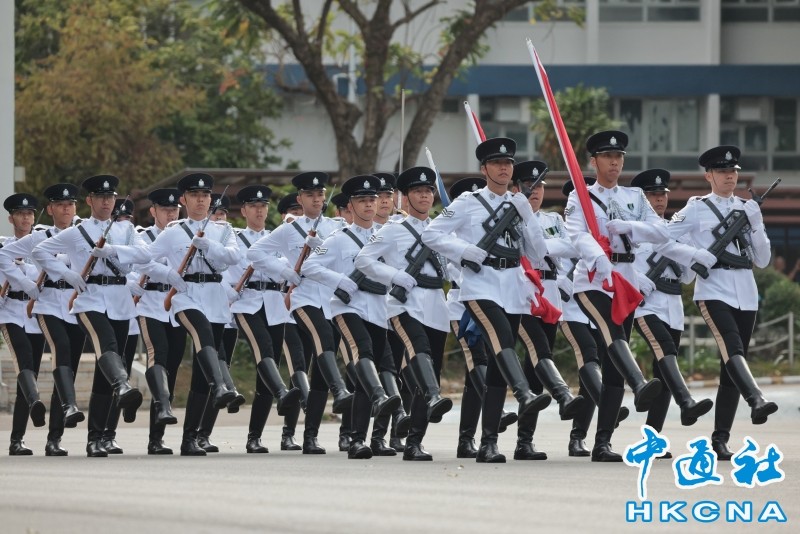 1月25日,香港警察學院舉行結業會操。(香港中通社記者 謝光磊 攝) 蕭澤頤說,警隊有不同招募措施,包括在海外大學設招募快線。警方去年9月至10月,亦去了12間本地大學招募,收到897份申請,比之前升33.3%。至於內地大學的招募工作,下月至4月,警方會到成都及武漢進行招募。 警方已引入打擊太空油毒品的快速檢測工具。蕭澤頤說,去年首11個月,有206人涉及太空油毒品案件被捕,警方引入試紙,如有任何可疑,可在合適情況下進行測試。政府亦將在下月14日修訂附屬法例,把太空油毒品的主要成份依托咪酯正式列為毒品。 另外,元朗日前發生懷疑涉及黑幫的謀殺案,蕭澤頤說,打擊三合會及暴力罪案是警方首要行動項目,強調警方與黑社會勢不兩立,打擊暴力罪案不遺餘力。除了收集情報去打擊,亦會利用其他途徑,包括切斷金錢資源及情報主導行動等。(完) 【編輯:李冉】