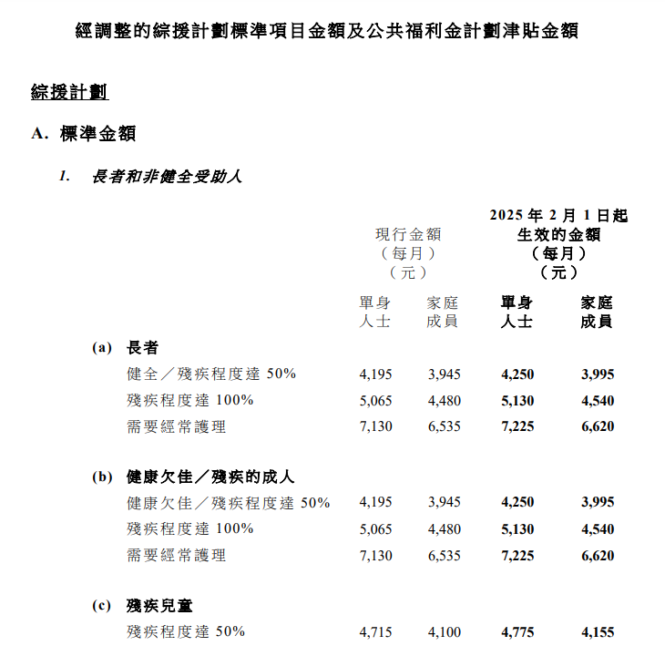 香港新聞網1月27日電 香港特區政府社會福利署27日公布,由今年2月1日起,上調綜合社會保障援助(綜援)計劃標準項目金額,以及公共福利金計劃的高齡津貼、長者生活津貼(包括廣東計劃及福建計劃發放的高齡津貼和長者生活津貼)和傷殘津貼金額。
