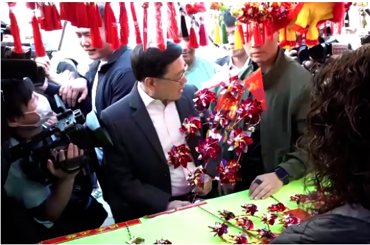 李家超除夕率官員落區逛年宵市場。視頻截圖 他現場花費350港元購買劍蘭、風車和大熊貓掛飾,又獲學生贈送如意結。看到攤檔生意理想,李家超十分高興,祝檔主“蛇年更勝龍年”、生意滔滔,祝願市民一切順利,家庭幸福,鼓勵大家多參與節慶活動,歡度新歲。 今年全港設有15個年宵市場,共計約1500個濕貨、乾貨和快餐攤位。謝展寰見記者時表示,預計吸引160萬人次進場,較去年多30萬人次,生意升近兩成。(完) 【編輯:李濼】