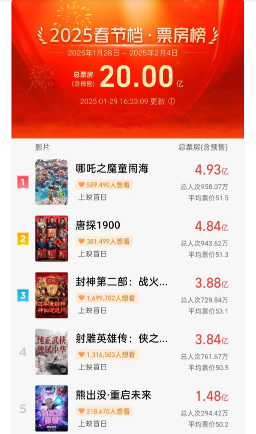 1月29日,六強爭霸徹底拉開帷幕。據央視新聞客戶端援引平台數據顯示,《射雕英雄傳:俠之大者》在預售期間獨佔鰲頭,但其上映首日的票房表現卻略顯乏力,從預售第一跌至第四位。相比之下,《哪吒之魔童鬧海》則憑藉強勁勢頭躍居票房榜首,單日實時票房高達6.45億。