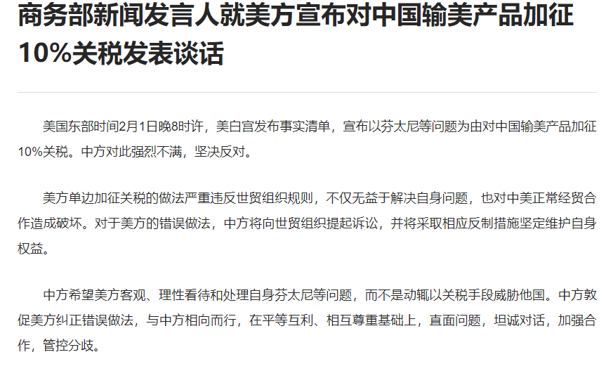 香港新聞網2月2日電 中國商務部新聞發言人就美方宣布對中國輸美產品加徵10%關稅發表談話。 美國東部時間2月1日晚8時許,美白宮發布事實清單,宣布以芬太尼等問題為由對中國輸美產品加徵10%關稅。中方對此強烈不滿,堅決反對。 美方單邊加徵關稅的做法嚴重違反世貿組織規則,不僅無益於解決自身問題,也對中美正常經貿合作造成破壞。對於美方的錯誤做法,中方將向世貿組織提起訴訟,並將採取相應反制措施堅定維護自身權益。 中方希望美方客觀、理性看待和處理自身芬太尼等問題,而不是動輒以關稅手段威脅他國。中方敦促美方糾正錯誤做法,與中方相向而行,在平等互利、相互尊重基礎上,直面問題,坦誠對話,加強合作,管控分歧。