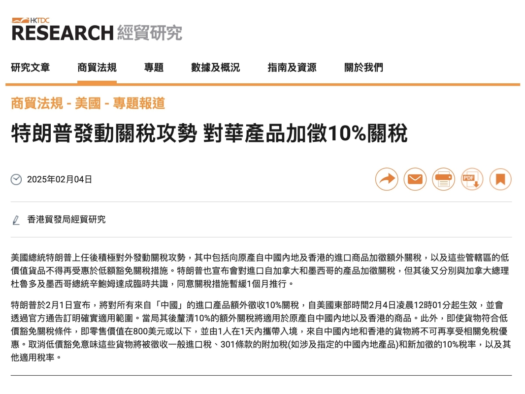 (貿發局網站截圖) 文章稱,2023年美國從香港的進口總額為41.158億美元,涉5800萬美元的進口關稅。如徵收10%額外關稅,2023年香港產品會面臨約4.1億美元的額外關稅責任;2023年香港在美國市場的貿易加權平均關稅稅率僅1.4%,如額外徵收10%的關稅,稅率將達到11.4%。 面對美國揮舞關稅大棒,香港正積極尋求應對方法。 香港中小型企業聯合會表示,商經局已找他們開會商討應對方法,年中會率團,帶領中小企尋找其他買家和廠房。 “除‘一帶一路’外,他們找了泰國、印尼、越南、馬來西亞、沙特阿拉伯及阿聯酋6個地方,因他們覺得當地發展成熟,我們生意可以與他們談一談。”香港中小型企業聯合會會長郭志華表示,“美國是一個很大的市場,但我們不能將一籃雞蛋放在同一地方。” 他指出,特區政府已要求有興趣的中小企提交名單,最快5月出團。(完) 【編輯:劉春】