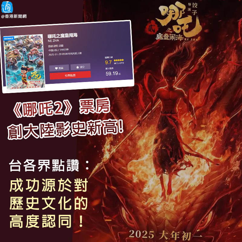 香港新聞網2月6日電 今日(6日),大陸2025春節檔電影《哪吒之魔童鬧海》(簡稱《哪吒2》)票房創造大陸影史新高,在境外也引發熱議。台灣各界點讚大陸文藝工作者深耕本土文化,科技發展也迎來大爆發,國產動畫走向世界指日可待。 據網絡平台數據顯示,截至發稿,《哪吒2》票房已達到59.19億,超越此前中國影史票房榜第一位的《長津湖》57.75億的票房,成功登頂中國影史第一! 《哪吒2》大獲成功在台灣引發熱議。台灣資深媒體人黃揚明點讚大陸賀歲檔電影扎根於本土文化這個豐富的資料庫,如《哪吒2》、《封神》等都是從中國古代神話、歷史故事中汲取靈感進行二次創作。 “哪吒講的是中國人自己的故事,半年前的(國產遊戲)《黑神話:悟空》也是中國人自己的故事。”台前海軍艦長呂禮詩認為,《哪吒2》成功的一大原因,是中國大陸對於歷史文化的認同感非常高。
