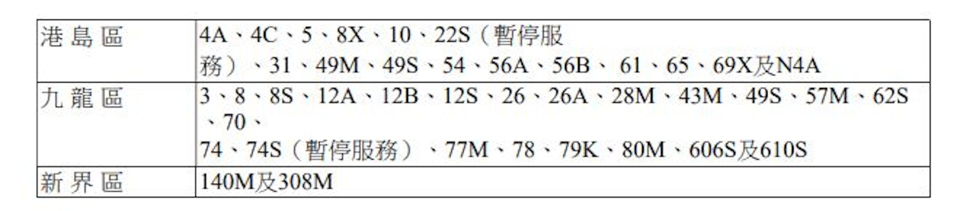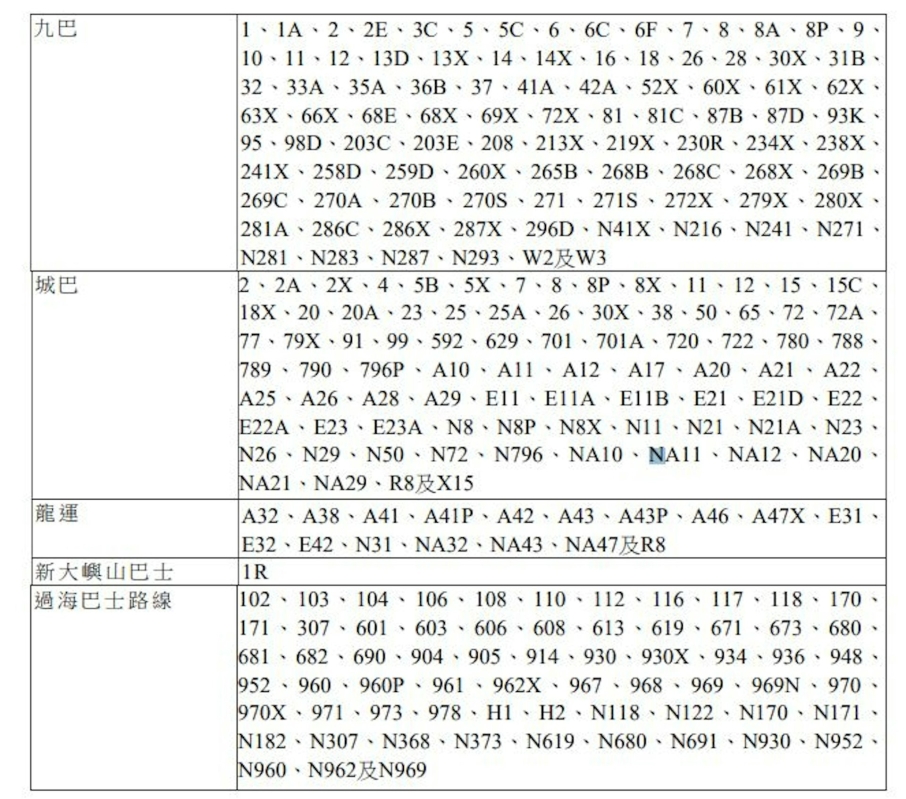 受影響須改道的巴士線