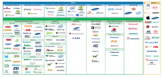 春晚機器人舞蹈展現了中國企業在人形機器人產業中的發展技術。 摩根士丹利進一步指出,當前人形機器人生態系統的現狀是,西方投資者在人形機器人投資組合中的選擇相對有限,主要集中在特斯拉和英偉達等少數企業上。這些而相比之下,中國在人形機器人領域的進展則顯得尤為突出。快科技援引其內容報道稱,這得益於中國初創企業受益於成熟的供應鏈、豐富的本土應用機會以及國家層面的大力支持。 報道指,在全球主要的人形機器人產品中,中國企業佔據了不可忽視的地位。智元機器人、傅利葉、星動紀元、優必選、宇樹和小鵬汽車等六家企業,與美國的Agility Robotics、Apptronik、波士頓動力、Figure和特斯拉等共同構成了人形機器人市場的主要參與者。 為了更清晰地展現人形機器人產業鏈的全貌,摩根士丹利將百強名單劃分為三大模塊:大腦公司、身體公司和集成商。大腦公司主要負責提供半導體和軟件,是實現人形機器人自主功能的關鍵,其中包括了甲骨文、西門子、meta、三星電子等國際知名企業,以及中國的百度和地平線機器人等。