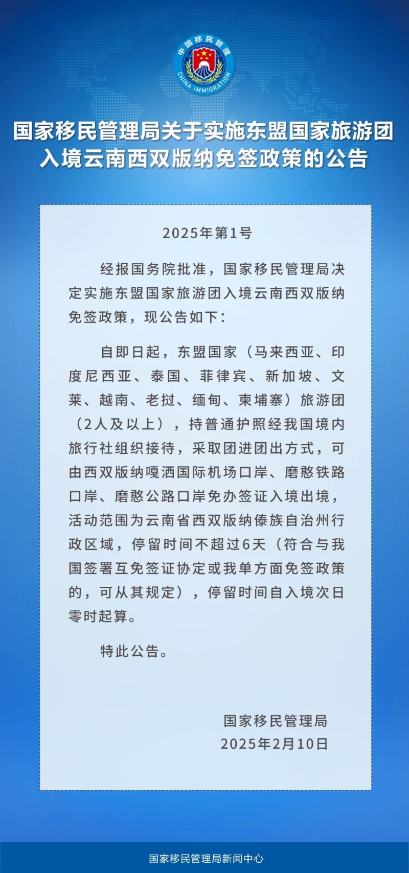 香港新聞網2月10日電 2月10日,中國國家移民管理局發佈公告,即日起,實施東盟國家旅遊團入境雲南西雙版納免簽政策。 馬來西亞、印度尼西亞、泰國、菲律賓、新加坡、文萊、越南、老撾、緬甸、柬埔寨等10個東盟國家的旅遊團(2人及以上),持普通護照經中國境內旅行社組織接待,可由西雙版納嘎灑國際機場口岸、磨憨鐵路口岸、磨憨公路口岸免辦簽證整團入境出境,活動範圍為雲南省西雙版納州行政區域,停留時間不超過6天。