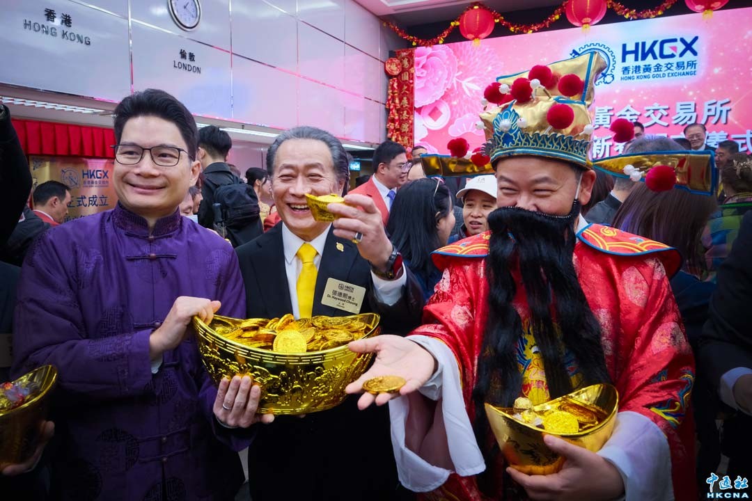 2月3日,香港黃金交易所舉行新春開市儀式。圖為香港特區政府署理財經事務及庫務局局長陳浩濂(左)和香港黃金交易所主席張德熙(中)派“金元寶”。(香港中通社記者 許其皓攝)