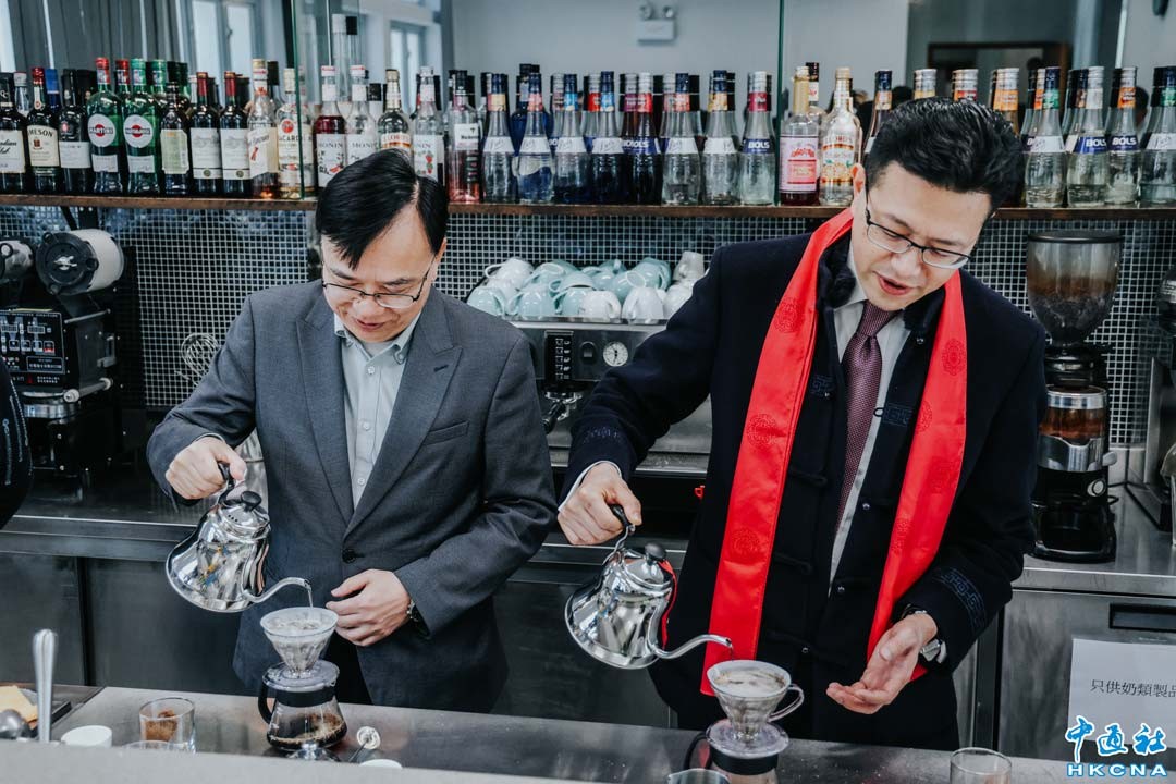 2月5日,香港工聯會舉行新春團拜活動,介紹工聯會2025年的重點工作。圖為工聯會會長、立法會議員吳秋北(右)、工聯會理事長黃國。(香港中通社記者 曹文毓攝)