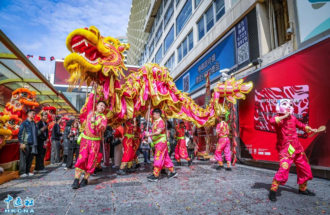 2月6日,香港海港城將於海運大廈露天廣場舉辦“金龍獻瑞醒獅賀歲”活動,新春佳節氛圍熱鬧喜慶。主禮嘉賓於活動主持點睛儀式後,金龍和醒獅在熱鬧的鑼鼓聲中跳躍翻騰,預示蛇年事事順境、風生水起。(香港中通社記者 曹文毓攝)