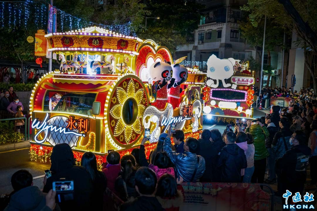 2月8日,澳門“金鱗昇輝歡樂春節 2025農曆新年花車匯演”第二場巡遊。當晚,澳門旅遊局“金鱗昇輝歡樂春節 2025農曆新年花車匯演”第二場巡遊舉行,17部閃爍奪目的花車滿載福運送到北區,延續節慶熱鬧氣氛,與居民和旅客慶蛇年。香港中通社圖片