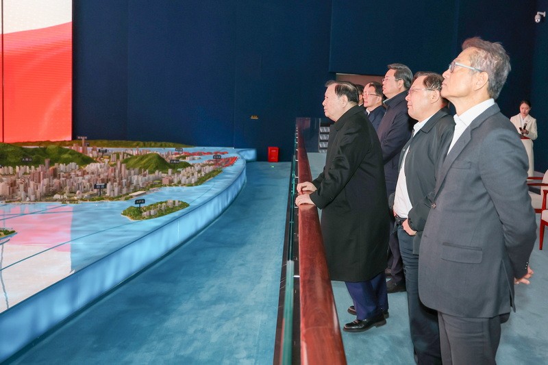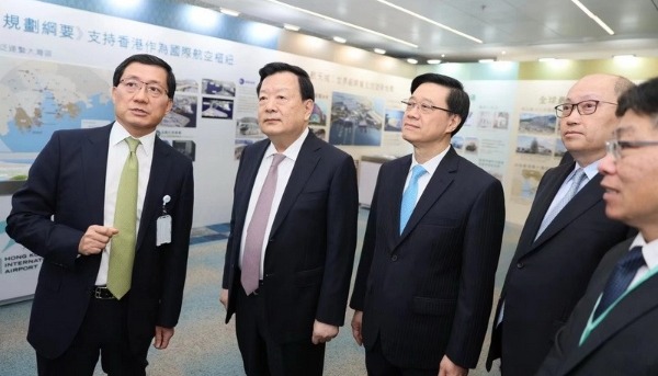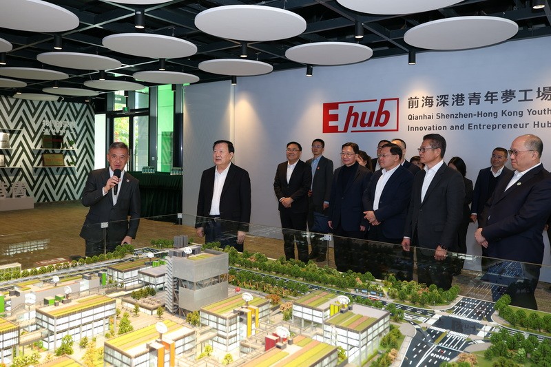 9日上午,夏寶龍先到皇崗口岸了解河套科研人員跨境通行便利安排情況,接著進港考察河套香港園區,在科創築城館聽取香港特區政府政務司司長陳國基、財政司司長陳茂波、發展局局長寧漢豪、創新科技及工業局局長孫東等介紹北部都會區和河套香港園區規劃建設及產業招商情況。之後,夏寶龍在前海展示廳聽取前海規劃建設情況介紹,并考察前海聯合交易中心,聽取香港交易所行政總裁陳翊庭和前海聯合交易中心負責人介紹有關情況。