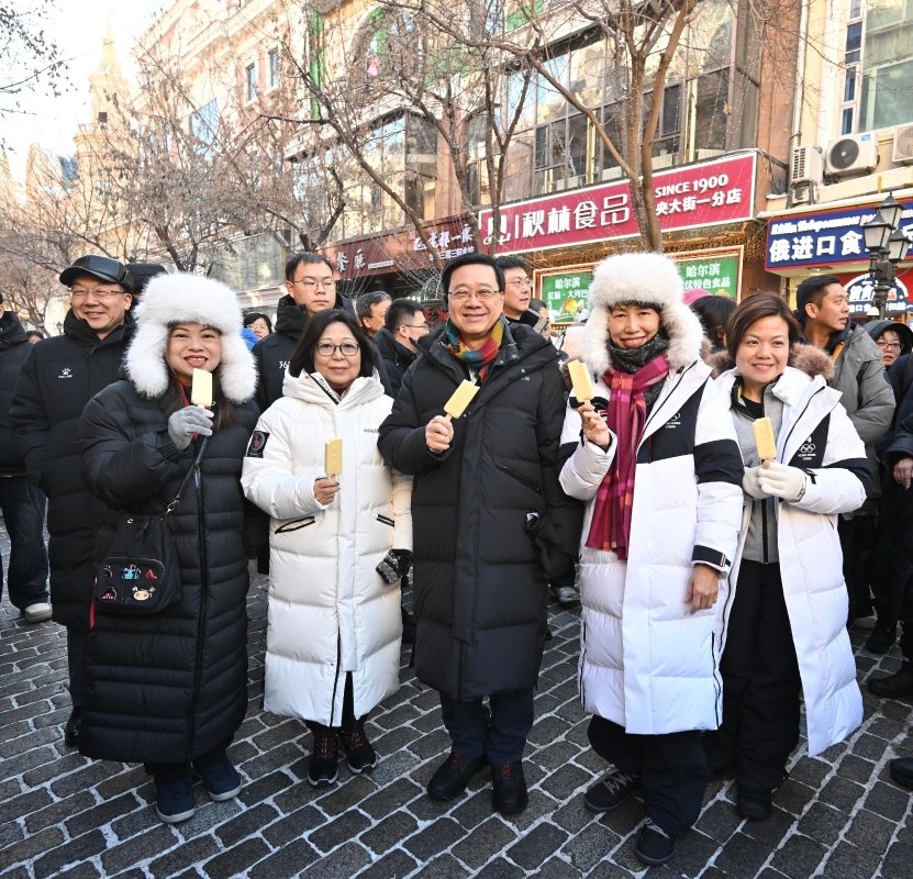 李家超(中)亮相哈爾濱中央大道。 李家超表示,黑龍江省以“冰雪經濟”作為經濟發展主要引擎,善用豐富的冰雪旅遊資源,同時積極推動冰雪運動發展,是將運動和文旅融合發展的榜樣,對香港很有啓發。以“冰城”哈爾濱的成功經驗,感受到體育、文化與旅遊的深度融合,能夠打造具特色的城市品牌,創造獨特的魅力和經濟價值。 他表示,香港特區政府會汲取國家成功舉辦大型體育賽事的豐富經驗,繼續推動香港的體育發展,同時全力以赴,與廣東省政府和澳門特區政府合力籌辦簡約、安全、精彩的第十五屆全國運動會。