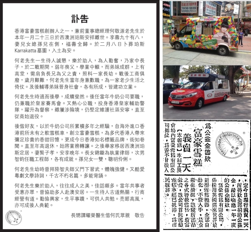 富豪雪糕共同創辦人何敬源的親屬在香港本地報章發訃告,形容何敬源為香港人“帶來彌足珍貴的香甜回憶”。(圖源:維城觸蹟FB) 富豪雪糕來港時風頭一時無兩,更一度創下一小時賣1600支雪糕的紀錄,而且市場上少有競爭對手,原因之一可能是成本問題。當時訂購一輛雪糕車很昂貴,據聞需要花費20萬元,相比當時的住宅單位,上車盤售價只需約1至2萬元,一架雪糕車的價值就等同超過10個單位!有讀者會問,為何創辦人選擇《藍色多瑙河》這首圓舞曲循環播放,是因為當年許多音樂盒都使用它,並且在獲得特許經營權後,何敬源表示在眾多歌曲中唯獨認得這首,因此沿用至今,成為雪糕車的象徵。