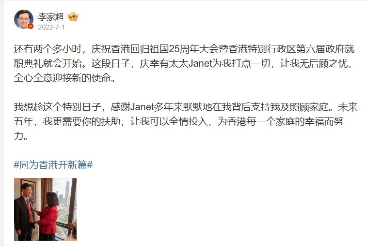 李家超微博截圖 2023年7月1日,李家超也在社交媒體上載一張與太太牽著手的照片,稱“今天是香港回歸祖國26周年的大日子,太太麗嬋穿了一身中式華服,與我一同出席慶祝回歸活動。”他還寫道:“轉眼,上任已一年了。非常感謝太太一直陪伴在側,與我攜手經歷每一個重要時刻。”