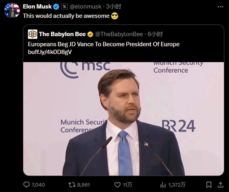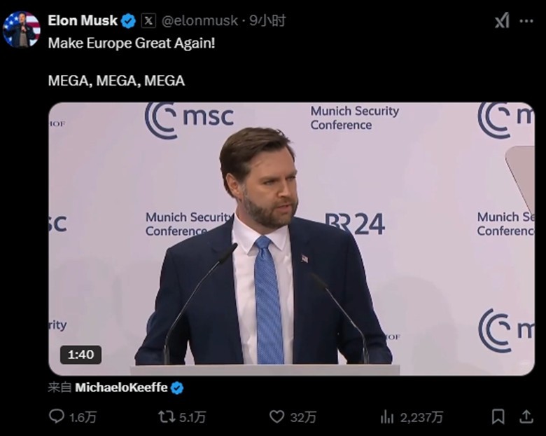 特朗普就萬斯演講回答記者提問。社媒視頻截圖 馬斯克轉發了呼籲萬斯擔任“歐洲主席”的推文,讚揚他發表了“讓歐洲再次偉大”(MEGA)式演講。 “希望歐洲人能够認識到,他們搭美國便車的日子已經結束了。”美國得克薩斯州共和黨參議員約翰·科寧在萬斯演講後表示,“歐洲原本過得還不錯,但那樣的日子已經一去不複返了。”