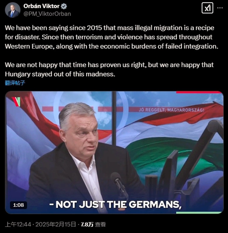 歐爾班回應萬斯的演講。社媒X推文截圖 “萬斯演講前,歐洲人可能還心存一絲幻想” 萬斯在慕尼黑安全會議上發表了激情洋溢的演講,這是他以美國副總統身份在世界舞台上的首次亮相。演講結束,他震動歐洲大陸,成為整個會議期間與會者的討論焦點。 一名東歐高級官員表示,在慕尼黑,“沒有人談論其他任何事情了”。 “這是一場美式的‘讓美國再次偉大’(MAGA)演講。”Politico EU稱,萬斯沒有詳細討論慕尼黑安全會議的主題——國防和安全。儘管面對強烈非議,但很多人承認,萬斯的真正受眾并不在慕尼黑,而是在美國國內的MAGA群體,并取得了成功。 當日晚些時候,美國總統特朗普對萬斯大加讚賞。他說,萬斯的演講“非常精彩”“很受歡迎”,歐洲對萬斯所提的言論自由、移民等問題“必須小心”。