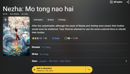 香港中通社2月15日電 (香港中通社記者吳一帆)近日,中國導演餃子執導的動畫電影“哪吒”系列第二部《哪吒之魔童鬧海》(下稱《哪吒2》)創造了全球票房(含預售)突破100億元人民幣的歷史性佳績,躋身全球電影票房榜前20及全球動畫電影票房榜前三。《哪吒2》已踏上海外上映的征途,儘管口碑頗佳,卻仍前路漫漫。