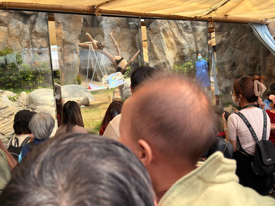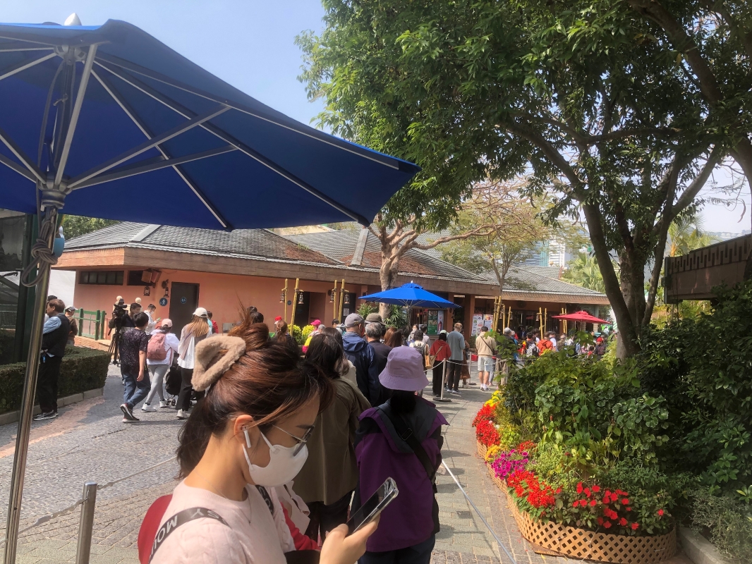香港新聞網2月18日電 隨著中央贈港大熊貓“安安”、“可可”落戶香港,以及港產大熊貓龍鳳胎的誕生,香港掀起“熊貓熱”!旅遊平台攜程表示,觀察到自香港海洋公園公布大熊貓龍鳳胎的亮相時間後,平台上海洋公園整體預訂人數按年升2成,當中成人門票預訂人數更大幅上升5成。 在港出生的大熊貓龍鳳胎“家姐”和“細佬”,首日(16日)與公眾見面已有逾5000人參觀,打破單日最多人參觀的紀錄。海洋公園估算,昨日(17日)又有近4000人次的訪客,進入大熊貓龍鳳胎所在的“大熊貓之旅”展館。 在大熊貓龍鳳胎亮相後的第一個工作日,粉絲熱情未減。園方表示,17日早上8時多已有人到達公園入口等待,全日展館內訪客駱驛不絕。香港新聞網記者昨日1時許亦抵達大熊貓龍鳳胎所在的展館,雖然當日是工作日,依然有不少人前來探望大熊貓龍鳳胎,現場排起長隊,指示牌顯示輪候時間約45分鐘。