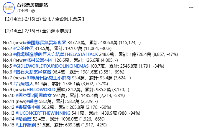 香港新聞網2月18日電 新上映的漫威電影《美國隊長4》全球票房不及預期,創系列最差口碑,但在台灣地區卻擊敗了含《台灣超人》在內等所有影片,奪得票房第一。台灣網友苦笑“實在沒什麼好看的”,希望大陸動畫電影《哪吒之魔童鬧海》(《哪吒2》)來台上映。 根據台北票房觀測站2月17日發佈的數據顯示,在剛剛過去的周末(2月14日-2月16日),全台票房總和為5565.3萬新台幣(合約1251.67萬人民幣),觀影人數為19.3萬人,較上周上升31.2%。 《美國隊長4》以3377.3萬元新台幣(合約759.57萬人民幣)的成績奪得台灣地區票房榜首,累計票房4806.8萬新台幣。而排名第二的《完美伴侶》的票房只有第一名的零頭,僅有313.5萬新台幣(合約70.51萬人民幣)。緊跟其後的《劇場版進擊的巨人完結篇THELASTATTACK》《北村公寓4:44》等更是慘淡。 台灣本土製作紀錄片《台灣超人》是排名前十中唯一的華語片,在剛剛過去的周末僅有84.4萬元新台幣(合約18.98萬人民幣)的票房,排名第八。此前台當局副領導人蕭美琴出席其首映禮,表示“力挺”。