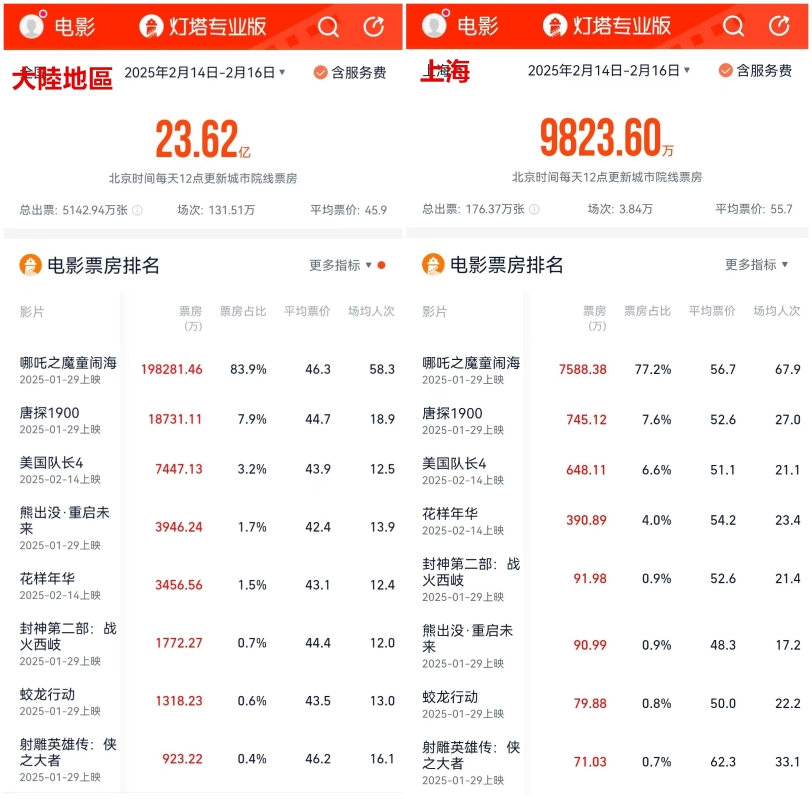 臉書“台灣票房觀測站”截圖 這與同期大陸電影院人氣爆棚的現象形成鮮明對比。 據燈塔專業版數據顯示,2月14日-2月16日,大陸電影總票房為23.62億人民幣,觀影人次達5142.94萬。其中,與台灣地區人口總量相近的上海市(都在2400萬人左右)票房總和為9823.6萬人民幣,觀看人數為176.37萬人。 《美國隊長4》排名第三,前兩名為最近火爆全球的大陸動畫電影《哪吒2》和另一部大陸的懸疑喜劇電影《唐探1900》。