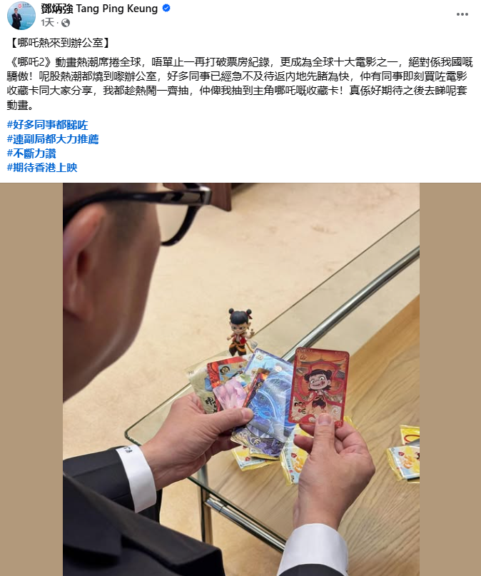 圖源:鄧炳強fb 鄧炳強表示,《哪吒2》不止一再打破票房紀錄,更成為全球十大電影之一,絕對是我國的驕傲!熱潮都燒到了辦公室,好多同事已經急不及待回內地先睹為快,還有同事買了電影收藏卡同大家分享。 鄧炳強說,自己趁熱鬧一齊抽,還抽到了主角哪吒的收藏卡。他十分期待之後去看這部電影。 (完) 【編輯:譚暢】