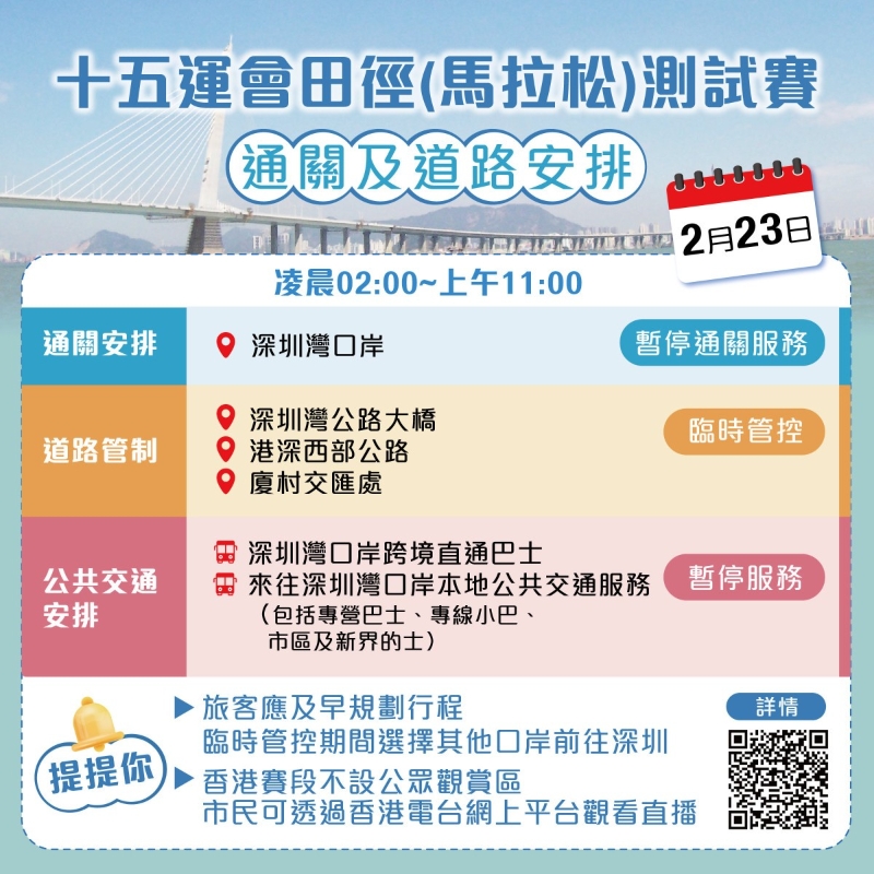 全運會馬拉松測試賽2月23日舉行。添馬台圖片。 香港特區政府表示,經深圳灣口岸來往香港和內地的跨境直通巴士、來往深圳灣口岸的本地公共交通服務包括專營巴士、專線小巴、市區及新界的士亦會暫停服務。另外,深圳灣公路大橋、港深西部公路及廈村交匯處將實施臨時管控措施,元朗公路東西行及廈村路所有車輛,禁止駛入深圳灣公路大橋、港深西部公路及廈村交匯處。持有深圳灣口岸許可證的跨境車輛(貨車、客車及私家車),可改用落馬洲(皇崗)口岸、香園圍口岸及文錦渡口岸出入境,通行時間依照各口岸的通關服務時間。運輸署呼籲旅客和駕駛人士及早規劃出行安排。 這是全運會歷史上首個跨境馬拉松賽的測試賽。比賽賽道全長42.195公里,其中香港段21.841公里、深圳段20.354公里,起終點均設在深圳,路線從深圳灣體育中心出發,經深圳灣口岸進入香港,繼而途經深圳灣公路大橋和港深西部公路高架橋,然後按相同路線折返深圳灣口岸,最終返回深圳灣體育中心終點。女子組和男子組分別由上午7時和7時半出發,跑約2公里後進入香港賽段,預料在香港路段作賽2小時。 另據“深圳公安發佈”微信公眾號20日消息,為確保比賽期間道路交通安全、有序、暢通,根據賽事運行需要,結合賽事特點、運動員行進時間節點以及各賽段周邊交通流情況,深圳交警對起終點、賽道以及外圍路段分時、分段採取臨時交通管制及滾動解封措施,動態壓縮交通管控範圍,同時結合市民出行需求規劃了詳細的繞行線路,最大限度減少對市民出行的影響。(完) 【編輯:石歡歡】