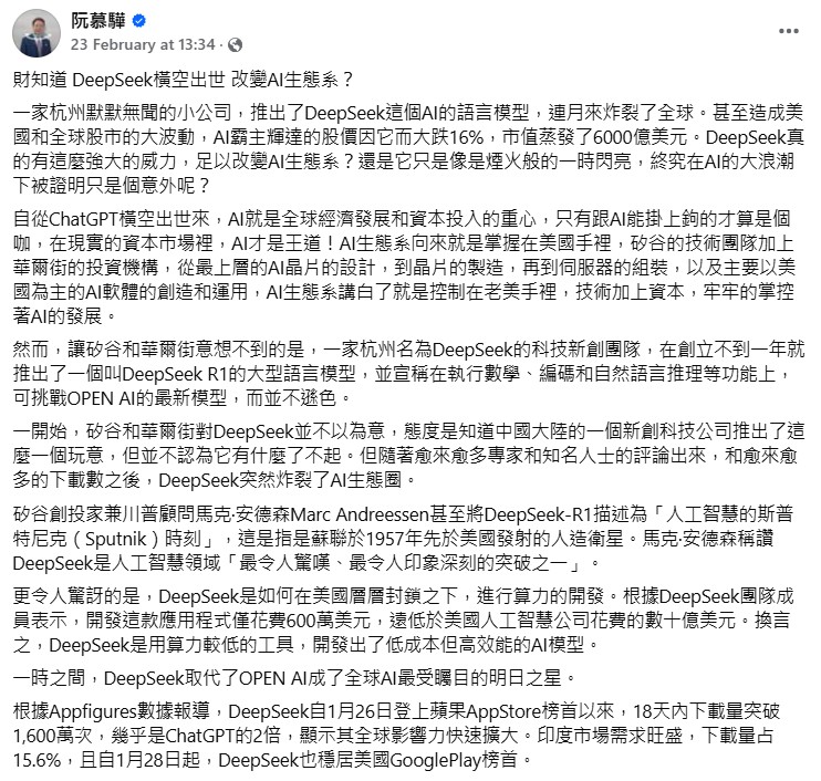 台灣財經專家阮慕驊2月23日在臉書發文評論DeepSeek。 阮慕驊表示,起初硅谷和華爾街對DeepSeek並不重視,認為其不過是中國一家新興科技公司的普通產品。然而,隨著越來越多專家和知名人士的評價,以及用戶下載量的激增,DeepSeek迅速成為AI領域的焦點,甚至取代了OpenAI,成為全球AI界最受矚目的新星。 根據Appfigures的數據,DeepSeek自1月26日登上蘋果AppStore榜首後,18天內下載量突破1600萬次,幾乎是ChatGPT的兩倍,顯示出其全球影響力的迅速擴展。特別是在印度市場,下載量佔比高達15.6%。此外,自1月28日起,DeepSeek也穩居美國GooglePlay榜首。
