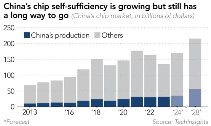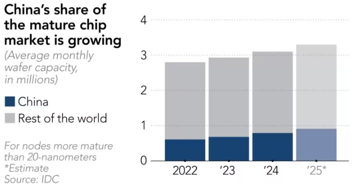 中國在成熟芯片市場的份額增長。《日經亞洲》製圖 與此同時,中國也迅速在成熟制程芯片領域取得進展。這類芯片(28nm及以上)被廣泛應用於手機、家電、汽車及國防裝備等領域。 據國際數據公司(IDC)的估算,到2025年,中國的成熟制程芯片產能將占全球市場的約28%。代表美國半導體產業利益的國際半導體產業協會(SEMI)進一步預測稱,到2027年這一數字可能會攀升至39%。 一家芯片開發商的高管告訴《日經新聞》:“就一些成熟的傳感器、微控制器和顯示驅動芯片而言,中國的芯片製造商在價格和服務上極具競爭力。” 值得一提的是,這家開發商同時是中國大陸芯片製造商和台灣台積電的客戶。比較兩種合作體驗後,這名受訪高管特別提到:“在台積電,所有最好的團隊都優先去服務先進芯片客戶了;但在大陸製造商這裡,你能得到最優秀的團隊來支持你的成熟制程芯片產品。” 台灣半導體測試接口服務商中華精測(CHPT)的總經理黃水可補充說,“現在你可以看到,就連一些服務於中國大陸市場的外國芯片製造商,也開始轉向大陸的芯片代工製造商來獲取產能,這比他們自己生產要便宜得多。” 《日經亞洲》報道稱,這種快速增長的背後,得益於中國在美國尚未限製出口的領域加大了建立國內供應鏈的力度。面對美國對先進芯片的出口限制,中國加速了在不太先進但仍然重要的零部件和芯片領域的發展。 雖然距離真正的半導體獨立自主仍道阻且長,但中國的努力正在取得成效。總部位於加拿大的全球知名半導體行業觀察機構TechInsights的數據顯示,中國本地生產的芯片份額從新冠疫情前的15%左右,上升到了2024年的20%以上。