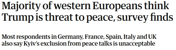 《衛報》報道截圖 《衛報》在6日的報道中稱,大多數歐洲人認為美俄將基輔或歐洲排除在和平談判之外是不可接受的。 報道說,“在特朗普明顯與俄羅斯結盟後”,2月26日至3月4日進行的民意調查發現,英國、法國、德國、西班牙和意大利等五個國家的大多數人都認為,“美國總統已對歐洲的和平與安全構成極大或相當大的威脅。” 民意調查還顯示,一旦美國遭受攻擊,歐洲人明顯不太願意在軍事上提供支持,而且他們也更加懷疑華盛頓是否會履行其在北約條約下的集體防禦承諾。 事實上,西歐民眾有這種情緒也情有可原。 特朗普第二任期上台後,繼續奉行“美國優先”政策,對盟友也是四處出擊毫不手軟。多次宣稱要將加拿大變成美國第51個州,要求丹麥“割讓”格陵蘭島,要求巴拿馬交出運河,隨後更是揮舞關稅“大棒”痛打歐洲盟友。