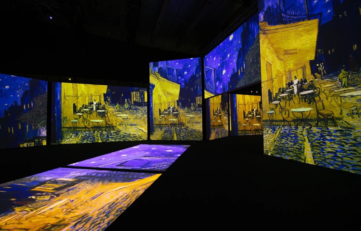 “再見梵高”光影體驗展現場。(香港中通社記者 黃璇攝) “再見梵高”世界巡迴展覽先後登陸全球90多個城市,由3月10日起重返香港。由Grande Experiences籌備,梵高光影展香港站展示近30座巨幕,透過光影技術展現梵高的著作《向日葵》、《星夜》和《麥田群鴉》。現場匯聚3000幅作品和珍貴影像,配合香氛元素和舒伯特、巴哈等音樂大師的經典樂章;並設有互動實景裝置,包括繪畫教程和《亞爾的臥室》的真實場景,打造沉浸式藝術體驗。 全新推出“AI梵高”在香港首度展出,透過AI科技令梵高彷如重生,以不同的視角欣賞這位藝術大師的成就。 香港故宮文化博物館“流動的盛宴——中國飲食文化”