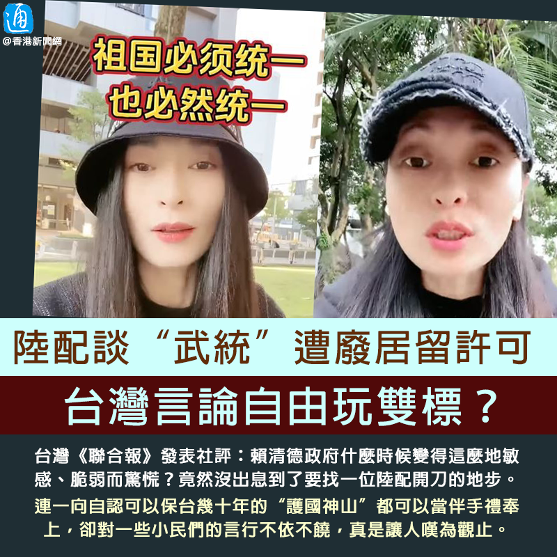 陸配談“武統”遭廢居留許可 台灣言論自由玩雙標?香港新聞網3月12日電 因在社交平台上講“兩岸統一”,陸配網紅竟遭台當局廢止居留許可,將面臨家庭分離等一系列問題…… 台灣“移民署”3月11日宣布,“依法”廢止大陸籍配偶網紅劉振亞的在台依親居留許可,並擇期安排其出境。理由是劉振亞在社交平台談及“大陸武統台灣”,影響社會安定。 劉振亞在大陸社交平台抖音的賬號“亞亞在台灣”有逾45萬名粉絲關注,她拍片分享在台灣的生活,也關注大陸的發展,並多次表示“兩岸一家親”。 台灣“移民署”聲稱,劉振亞的公開發言,如“大陸武力統一台灣,已經不需要其他理由”等,被認定“有危害安全或社會安定之虞”,因此“依法”展開調查。根據“大陸地區人民在台灣地區依親居留長期居留或定居許可辦法”,當局決定廢止其依親居留許可,並在5年內禁止其再申請依親居留。 劉振亞早前發布影片分享被“移民署”約談的過程。她提及,長達3小時的詢問中,工作人員詢問其家庭背景、拍片有無受人指使、有無向大陸官員拿錢等,並指她常在影片中提及大陸科技、軍事狀態,提及“武力統一”,涉及“恐嚇”等,“一直在類似問題上打轉,詢問變成盤問。” “兩岸統一是個人理想,有什麼不可以?統獨問題各大媒體都在談,怎麼我發表看法就不行?” 劉振亞質疑,台灣言論自由何在? 劉振亞強調,自己拍片初衷是希望兩岸同胞共榮,並無恐嚇意圖。“我是湖南人,嫁到台灣,兩岸都有親人,我才是最希望兩岸和平的,那些搞台獨分裂兩岸的,才是傷害台灣。” 此事在台灣引發討論。中國國民黨“立法院”黨團書記長王鴻薇今日(12日)表示,該陸配應享言論自由,台當局因此直接驅逐出境,會令大家質疑台灣的言論自由及法治。 王鴻薇質疑,該陸配還只是一介平民,就被如此對待,那長期接受外國資金贊助的民進黨“立委”沈伯洋,接觸到的是外事、防務相關機密資料,台當局都不用調查嗎? 台“內政部長”劉世芳同日辯稱,該陸配有言論自由,但言論自由不該是“支持武統”。 中國國務院台灣事務辦公室發言人陳斌華今日在例行記者會中痛批,民進黨當局用盡手段大肆打壓台灣持不同立場的聲音。再次暴露其所標榜的“自由”是鼓噪“台獨”的自由,是宣揚“抗中”的自由,既虛偽又雙標。如果任由民進黨當局到處濫用行政和司法手段,台灣民眾正當權益將遭到嚴重侵犯。 “賴清德政府什麼時候變得這麼地敏感、脆弱而驚慌?竟然沒出息到了要找一位陸配開刀的地步。”台灣《聯合報》亦發表社評指,如今的賴政府在外頭受了委屈、挫折,就在家裡頭打小孩出氣。現在眼見著烏克蘭被當了棄子,台灣恐也被當交易籌碼,賴政府不去思考如何自立自強、團結內部,竟還在怒吹集結號,如火如荼地搞起大罷免。