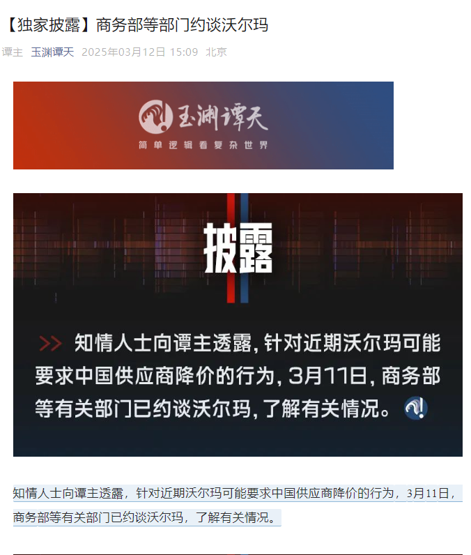 “玉淵譚天”12日引述知情者透露中國商務部約談沃爾瑪 “玉淵潭天”12日援引知情人士透露,中國商務部3月11日等有關部門約談沃爾瑪,原因是其要求一些中國供應商大幅降價,企圖將美對華加徵關稅的負擔轉嫁給中國供應商和中國消費者。 沃爾瑪要中國供應商一力承擔關稅的勇氣何來? 中國中央財經大學國際經濟與貿易學院副教授劉春生12日對香港中通社分析稱,沃爾瑪這一做法是基於其市場壟斷地位,簡單地想把成本壓給供應商,屬於 “店大欺客” 的行為,也是不合理的壟斷行為。美國加徵關稅,沃爾瑪作為零售商希望佔據談判優勢地位,逼迫供應商承擔全部關稅。畢竟在美國市場,漲價易遭消費者抵制,會引起社交媒體上的負面反響。 劉春生指出,沃爾瑪的經營策略主要是通過大量採購的方式獲利,單件商品利潤空間不大。因此受到關稅壓制時,就會向供應商和消費者兩頭擠壓。若逼迫供應商降價無果,就只能讓消費者接受高價,若價格上不去就可能自己承擔更多成本。 有經濟研究顯示,特朗普在2017至2020年第一任期內所加徵的新關稅,其經濟負擔最終大多由美國的消費者承擔,商品價格上升。 然而在當前的經濟環境之下,沃爾瑪要將成本轉嫁消費者面對一定壓力。另有指中國供應商的利潤空間原本就極為微薄,降價幅度若超過2%至3%,就會導致虧損,甚至可能被迫降低產品質量。劉春生認為,這反映在美國政府加徵關稅背景下,各方都承受巨大壓力,中美企業和美國消費者的利益同受損。 玉淵潭天稱,這次中國商務部約談有四個值得關注的信息點:一是沃爾瑪單方面要求中國企業降價,可能造成供應鏈斷裂的風險,損害中美企業和美國消費者的利益。二是沃爾瑪臨時要求中國供應商降價,有違反商業合同的可能。這樣會擾亂正常的市場交易秩序。三是美單邊加徵關稅傷害中美企業,中美企業應該攜手共同應對。四是如果沃爾瑪執意如此,那等待沃爾瑪的,就不只是約談了。 在劉春生看來,中國商務部果斷出手,是表明了強硬的態度和立場,警告商戶不能利用市場地位逼迫供應商降價,避免擾亂正常的市場交易秩序。(完) 【編輯:王瑤】