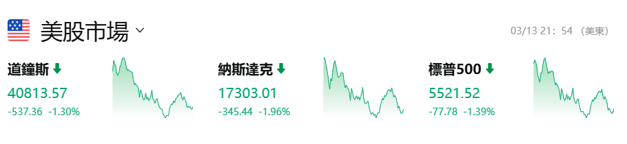美東時間3月13日股票市場。(圖源:富途網) 受美國總統特朗普、商務部長盧特尼克、財政部長貝森特連番表態衝擊市場情緒的影響,美股持續下跌。截止當天收盤,道瓊斯工業平均指數比前一交易日下跌537.36點,收於40813.57點,跌幅為1.30%;標準普爾500種股票指數下跌77.78點,收於5521.52點,跌幅為1.39%;納斯達克綜合指數下跌345.44點,收於17303.01點,跌幅為1.96%。 標普500指數較2月19日創下的歷史高點下跌逾10%,進入技術性回調區間,這是該指數自2023年10月以來的首次回調。而納指上周已進入回調區間,較去年12月的高點下跌超14%。道指較歷史高點下跌超9%,已十分接近回調區間。 大型科技股全線下跌,臉書跌超4%,跌逾3%,跌超2%,谷歌、跌超2%,跌逾1%,跌0.14%。 黃金受到避險情緒影響,創歷史新高。COMEX黃金期貨價格在早間突破3000美元/盎司關口,報3001.1美元/盎司,漲幅0.33%。與此同時,倫敦現貨黃金價格也刷新紀錄,報2990.2美元/盎司。