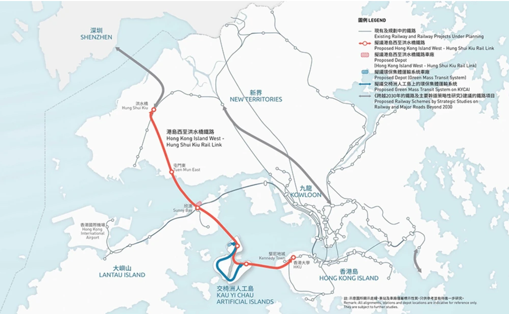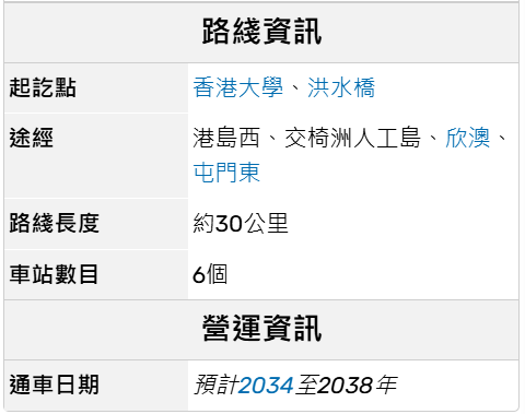 港深西部鐵路線路規劃圖。(圖源:香港鐵路大典) 港島西至洪水橋鐵路全長約30公里,從香港大學站開始,經港島西、人工島、欣澳及屯門東,並前往洪水橋站。按香港特區政府在2023年12月12日公佈的《香港主要運輸基建發展藍圖》規劃,本鐵路有望在2034至2038年落成。 政府指,為提升香港鐵路網絡的連通性,初步建議於鐵路沿線增設多個轉乘站,屆時乘客可於香港大學站轉乘港島綫、欣澳站轉乘東湧綫、以及於洪水橋站轉乘屯馬綫,方便市民出行。同時,政府亦會探討於堅尼地城增設車站轉乘港島綫的可行性,以加強鐵路網絡的抗禦能力,建議於欣澳填海造地設置鐵路車廠,方便日常營運及調配,以及在緊急情況下作靈活調度。